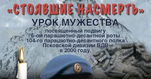 24.02.2021Департамент государственной политики в сфере воспитания, дополнительного образования и детского отдыха Минпросвсщения России информирует о проведении 3 марта 2021 года в 14:00 по московскому времени межрегионального Урока Мужества «Стоявшие насмерть», посвящённого подвигу 6-й роты 104-го полка 76-й Псковской дивизии ВДВ в 2000 году, не отступившей перед многократно превосходящими силами бандформирований.