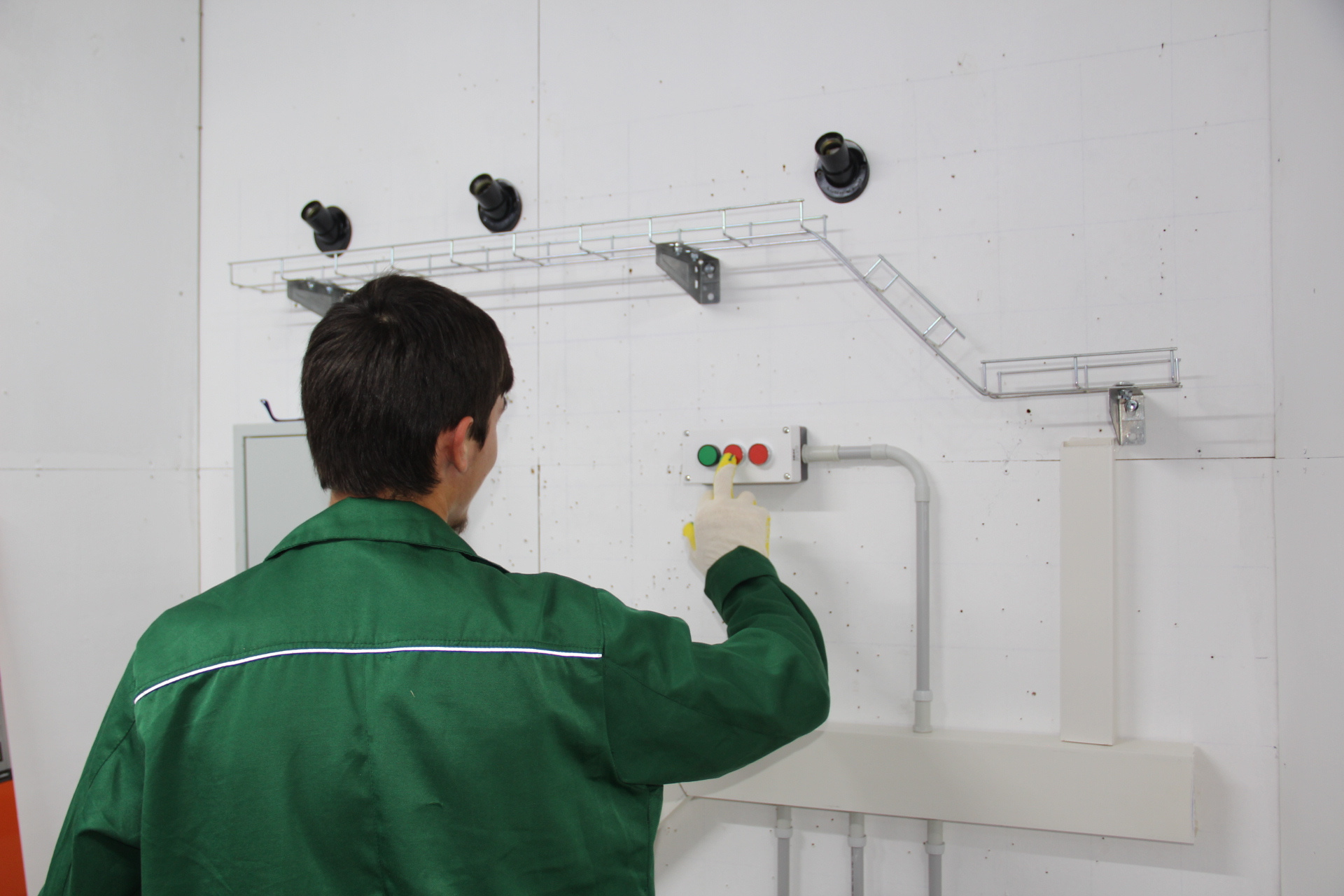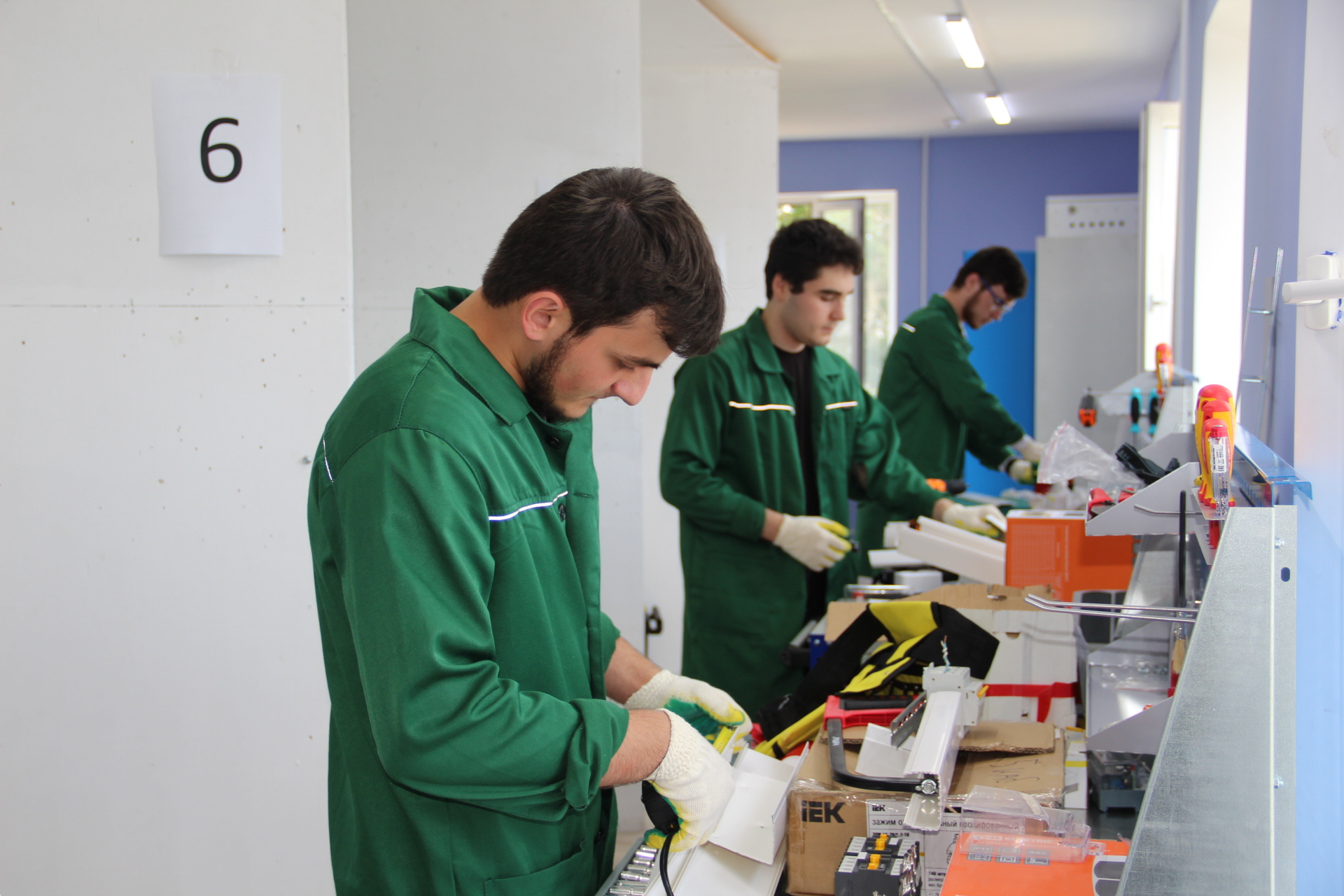 Участники выполняют задание «Монтаж в промышленной и гражданской отраслях». В отведенное время им необходимо выполнить монтаж электроустановки реверсивного управления асинхронным двигателем, включающего в себя кабеленесущие системы, элементы управления и сигнализации, выполнить монтаж и коммутацию НКУ руководствуясь монтажными, принципиальными или иными схемами, предусмотренными заданием. После этого участники на компьютере проводят программирование логического реле. Им необходимо создать программу управления логическим реле согласно заданного алгоритма. Среда программирования – FBD. По завершении экзаменов студенты получат Skills Passport.