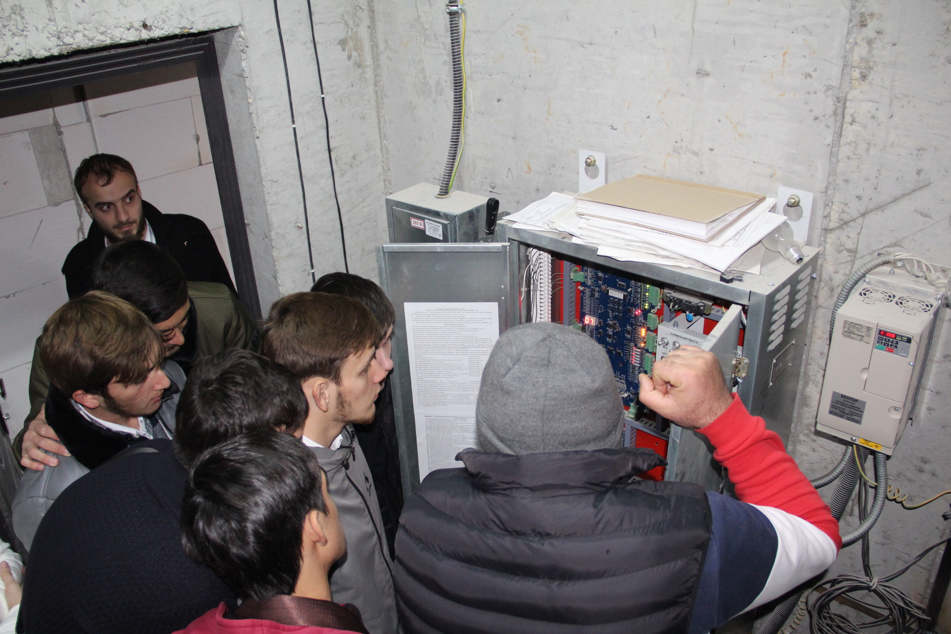 В соответствии с достигнутой накануне договоренностью между ЧГК и МУП "ГОРЛИФТ", заместитель директора предприятия Магомед Устарханов и электромеханик 4го разряда Магомед Мацакаев провели для студентов ознакомление с процессом обслуживания лифтов.