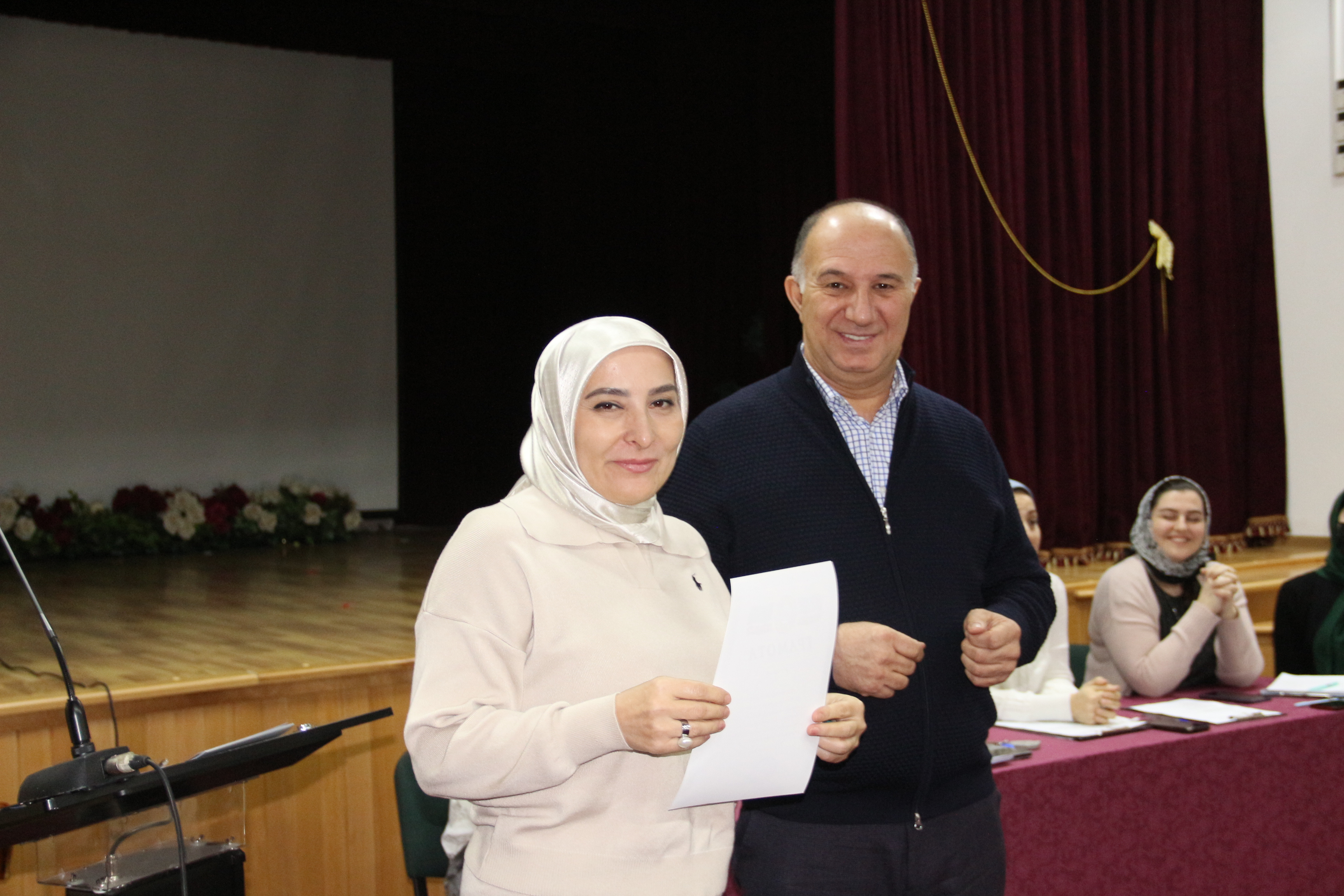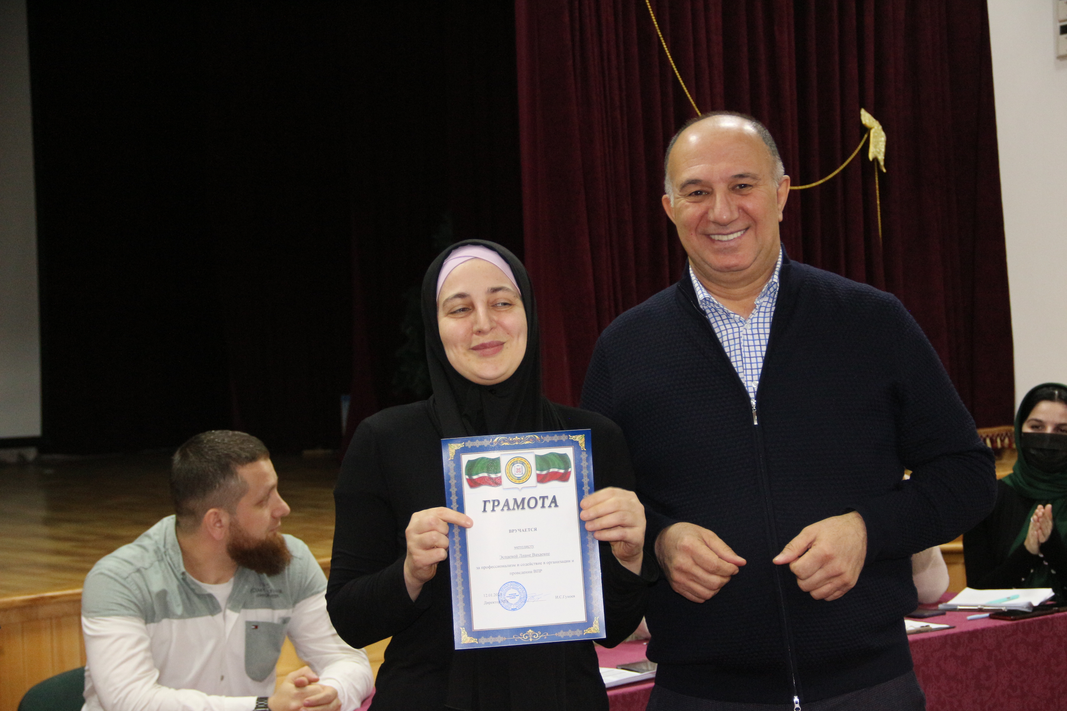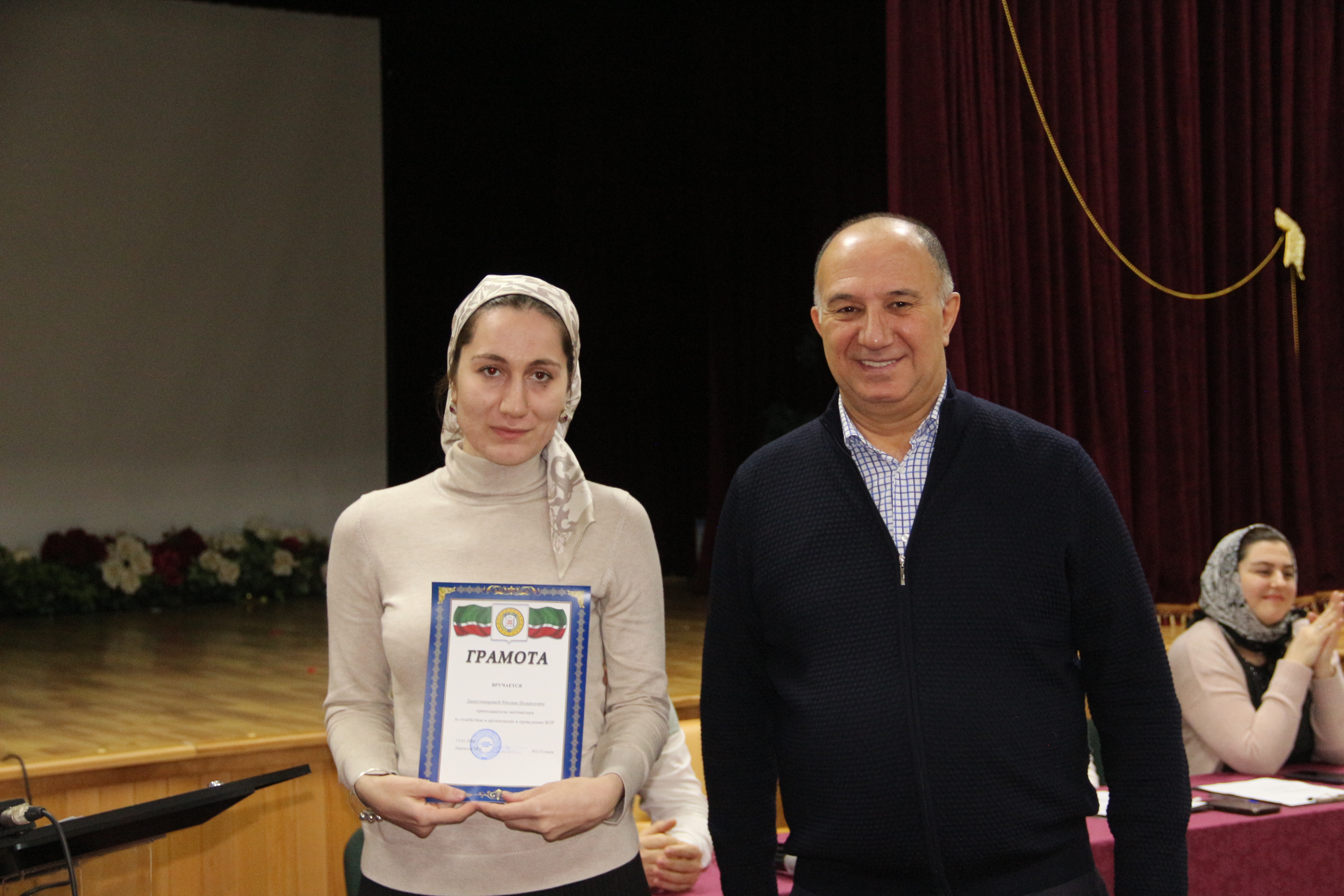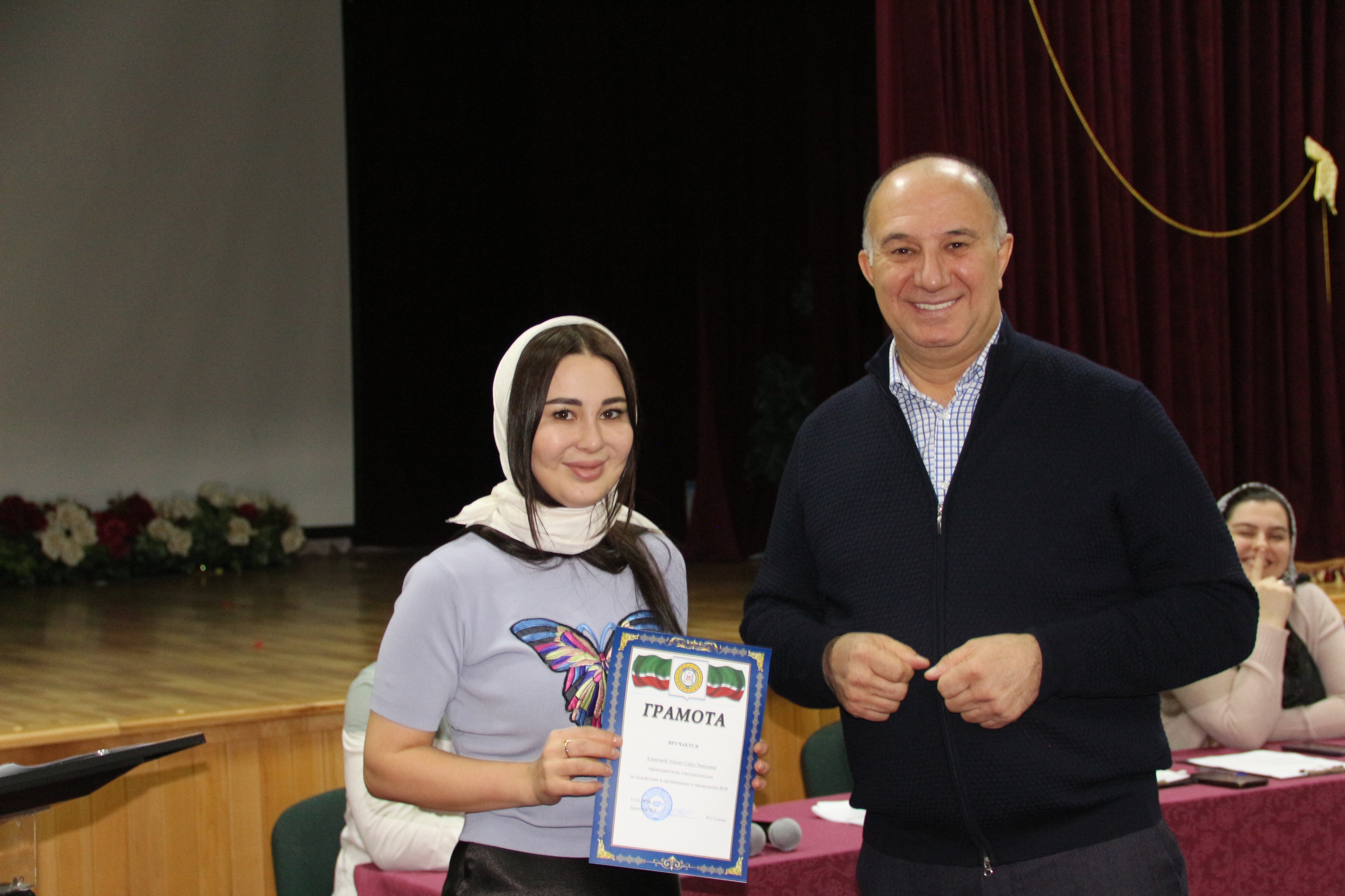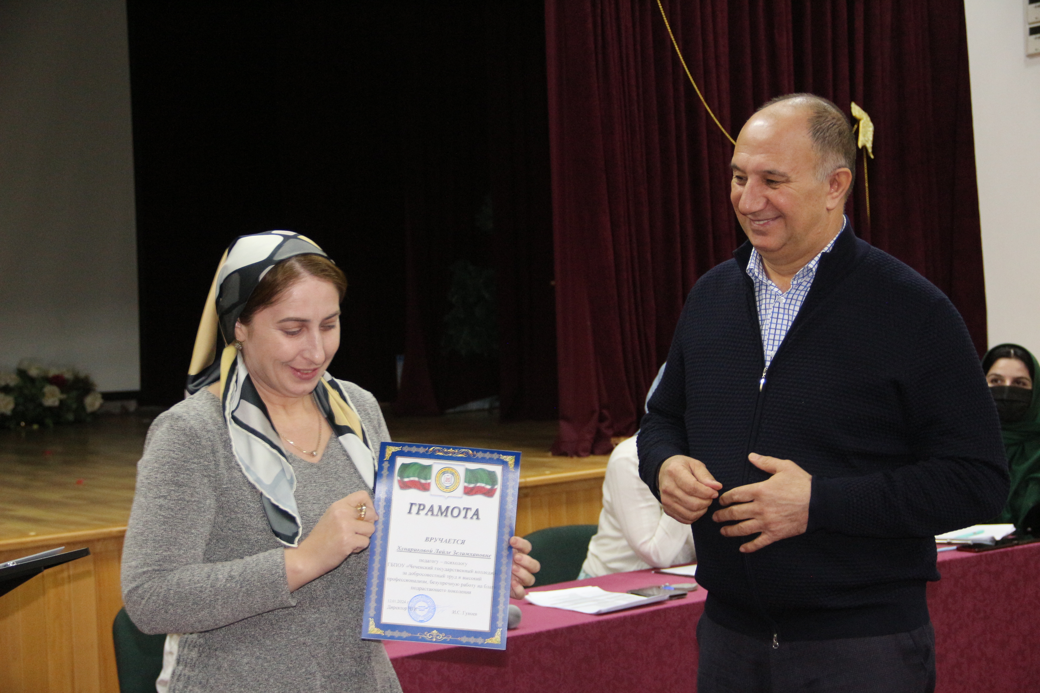 Директор колледжа Ибрагим Гуноев поздравил всех с наступившим Новым годом и вручил грамоты преподавателям внесшим значительный вклад в работу Кафедры ООД и «Год чеченского языка».