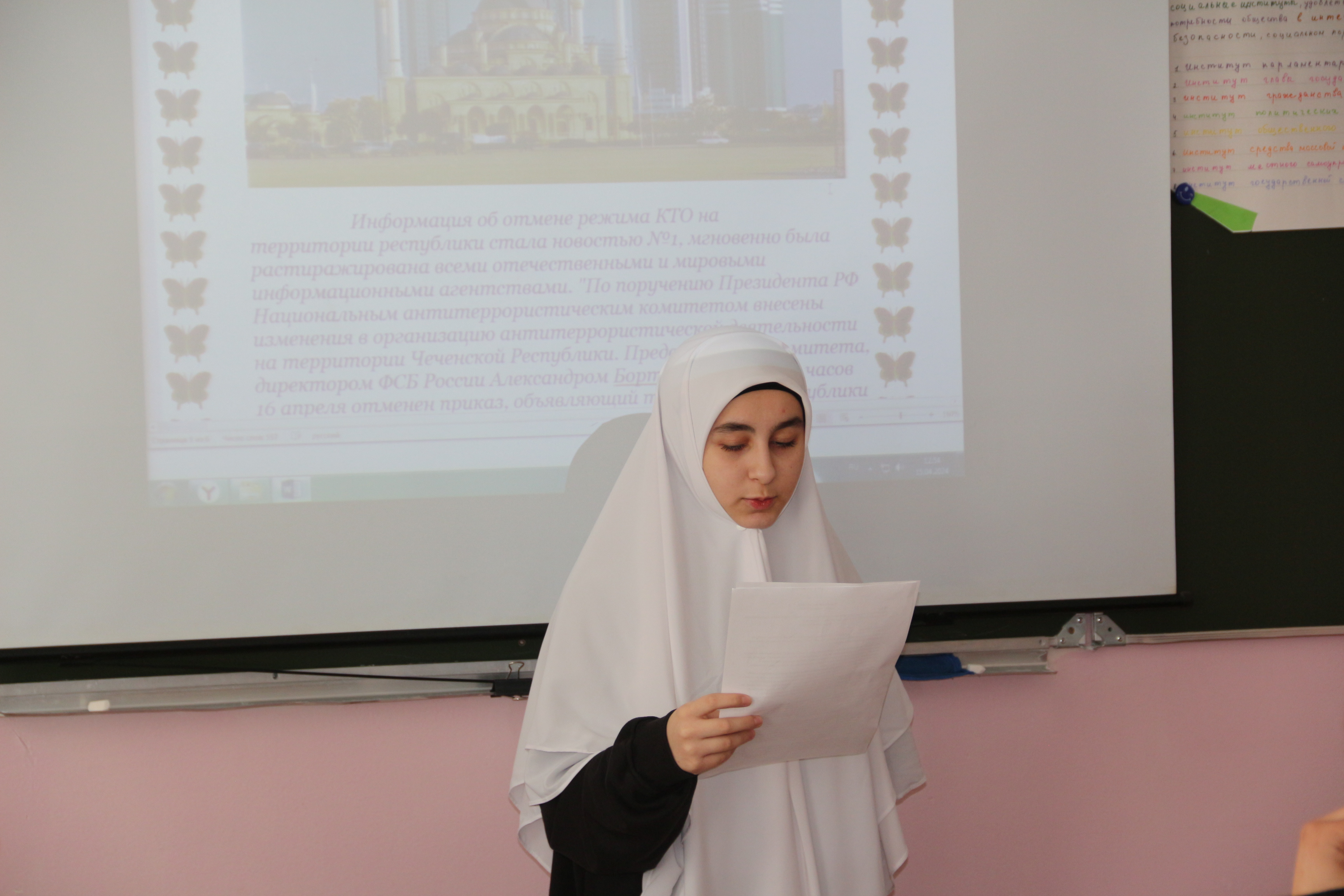 В преддверии Дня мира, 15 апреля в Чеченском государственном колледже прошли кураторские часы, посвящённые отмене КТО. Преподаватели рассказали студентам, какой ценою главе ЧР, герою России, Рамзану Ахматовичу Кадырову удалось добиться отмены КТО в Чеченской Республике.