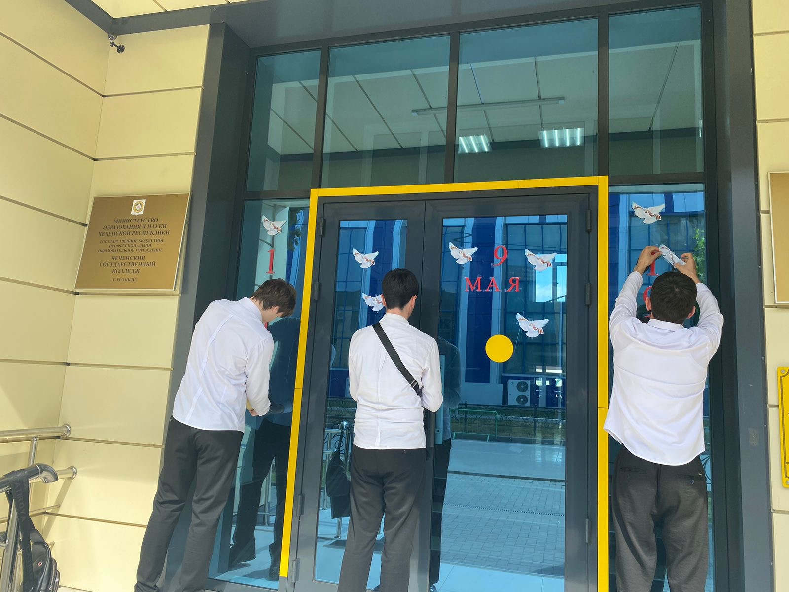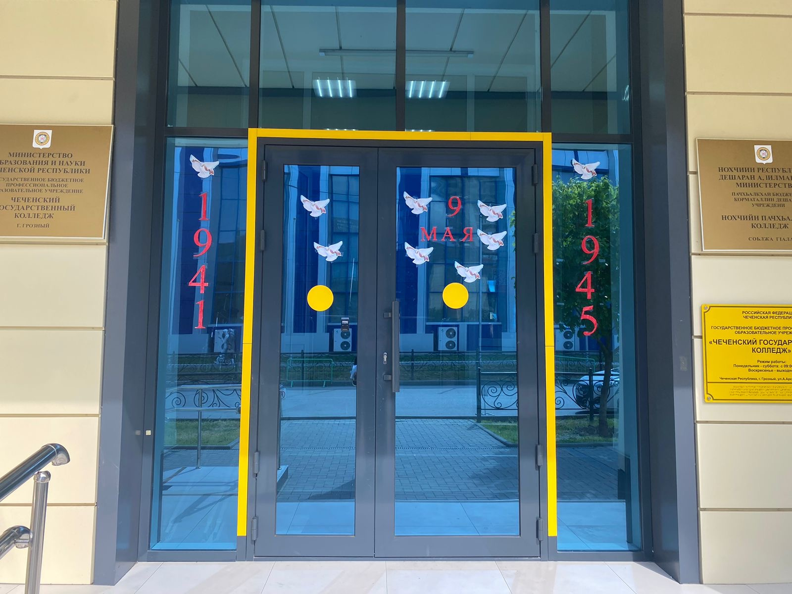 В рамках акции студенты ЧГК на окнах при входе разместили аппликации и наклейки, посвященные Дню Победы.
