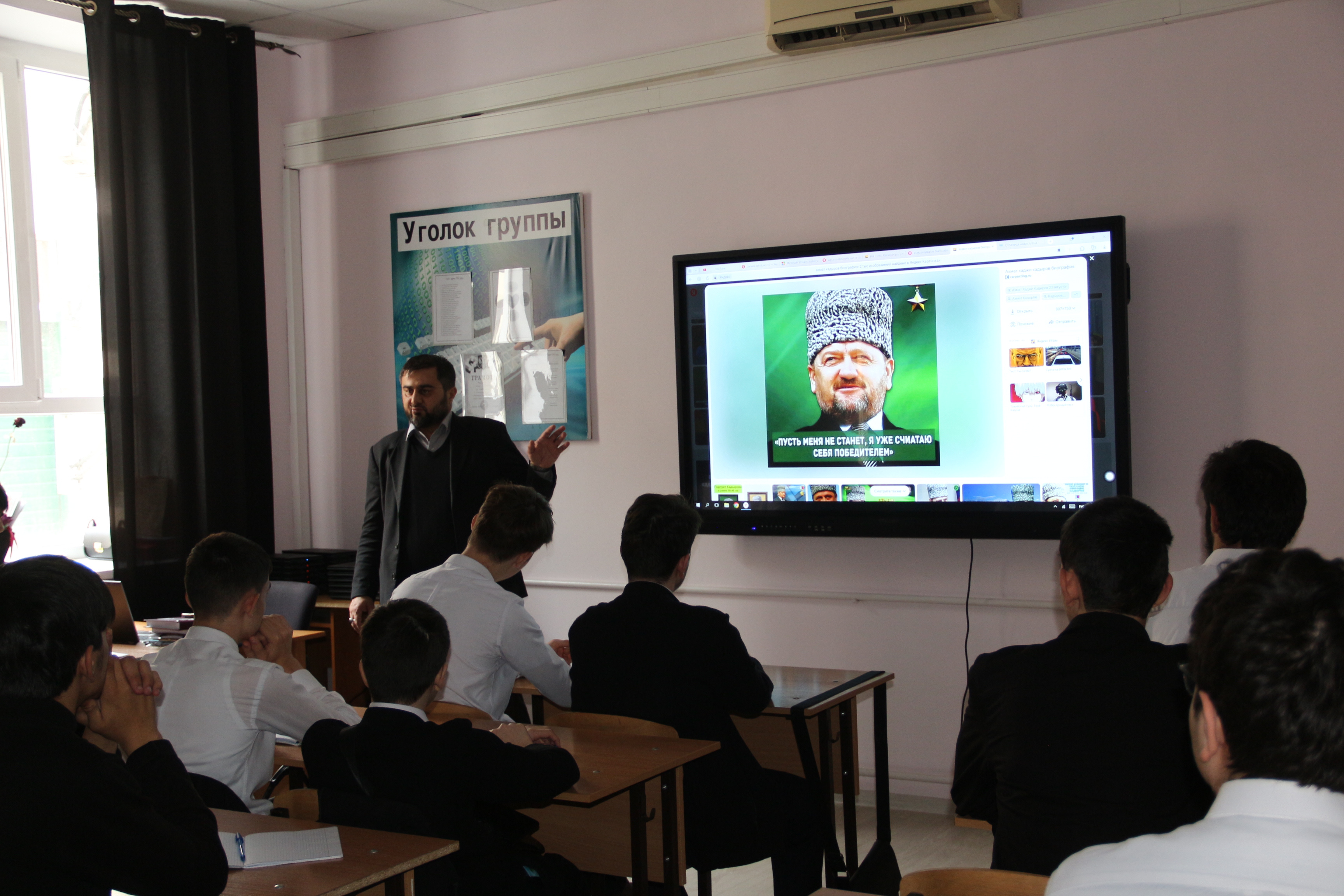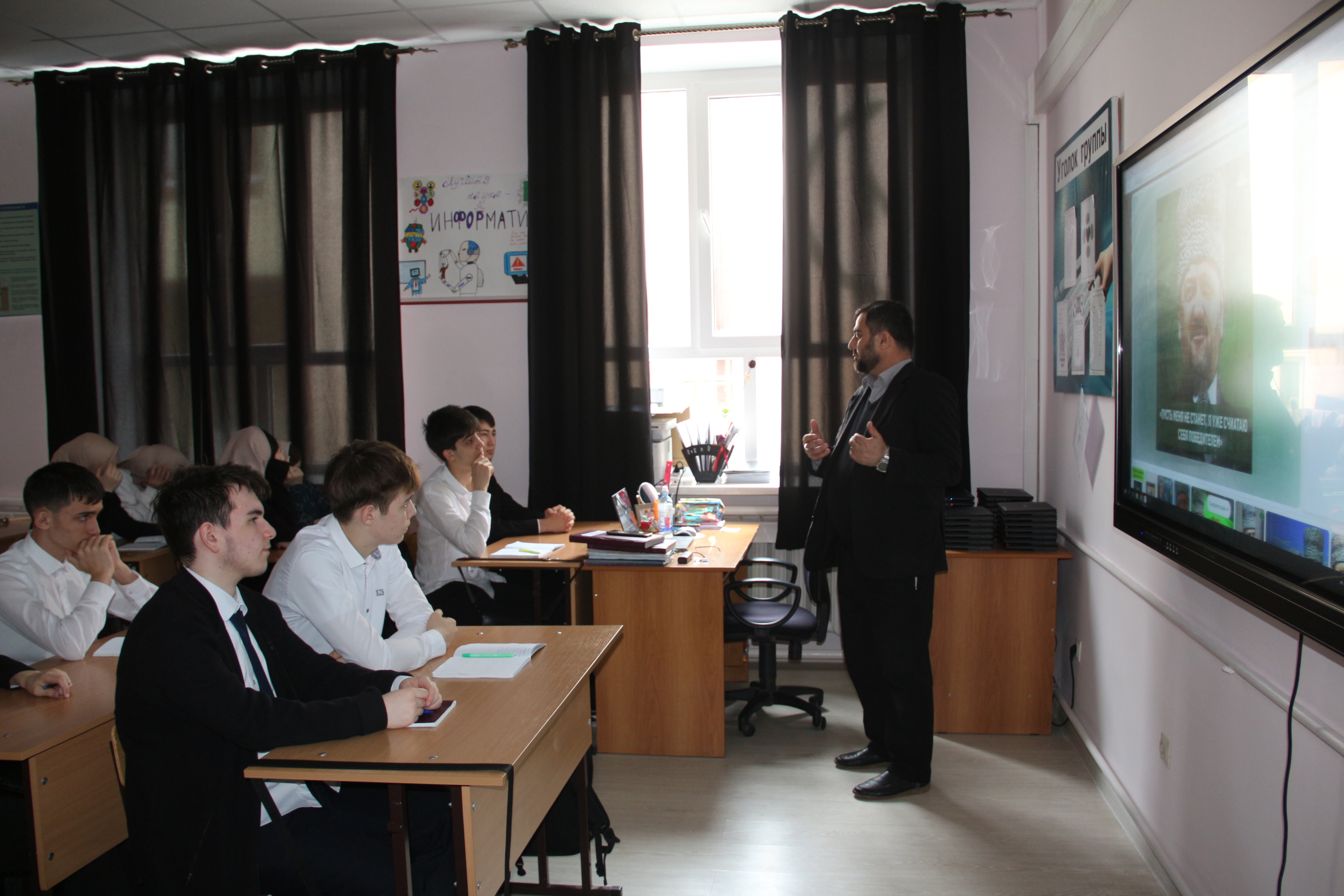Целью данного занятия было познакомить с биографией Первого Президента ЧР, Героя России А-Х.Кадырова, узнать какой вклад внес Ахмат Хаджи в дело процветания нашей республики, воспитывать у подрастающего поколения чувство любви к Родине, патриотизма.