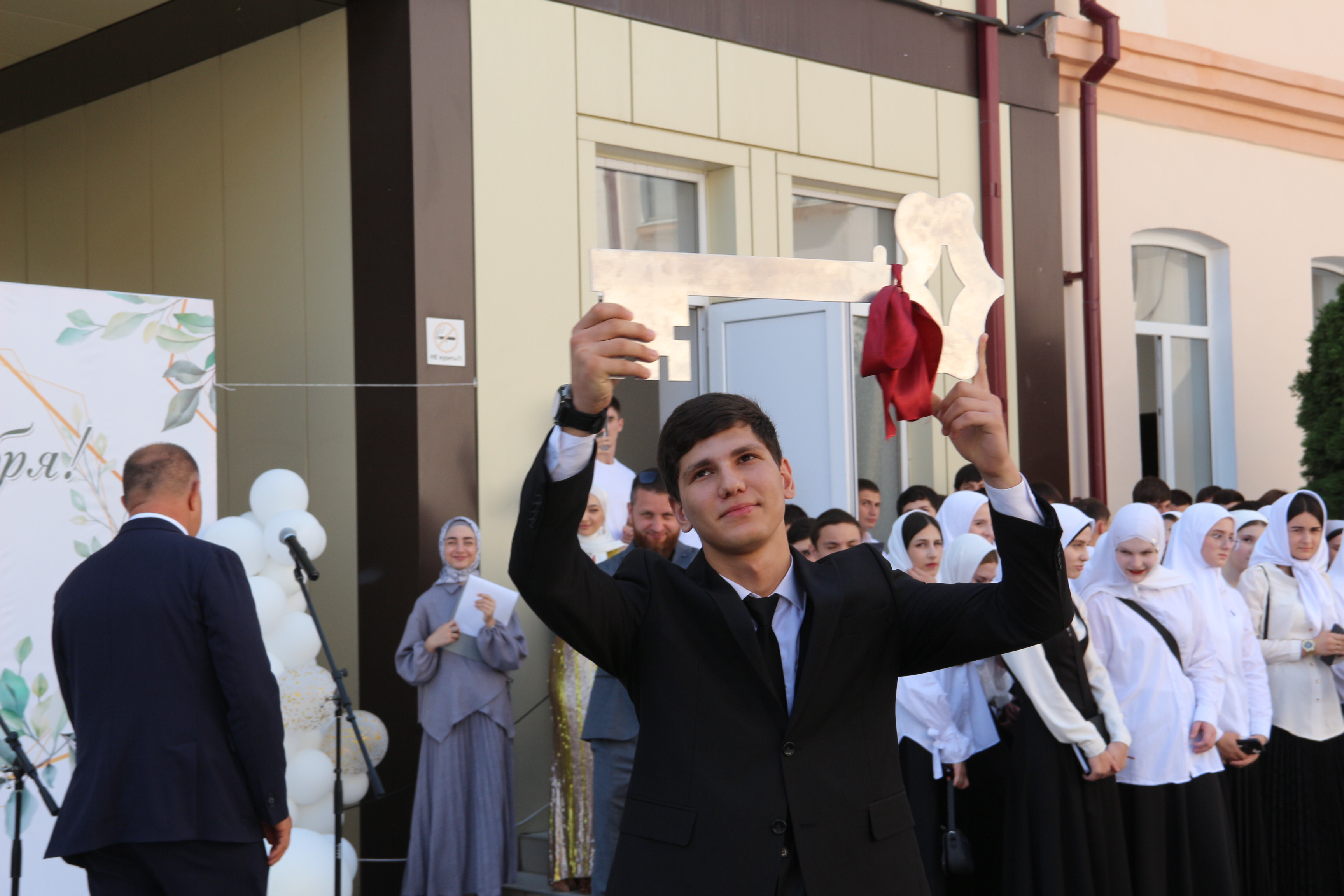 По давней традиции прошла церемония передачи символического «Ключа знаний» первокурсникам от выпускника первокурсникам. В этом году это право выпало лауреату Всероссийского конкурса РСМ «Студент года-2023» - Адаму Башаеву.