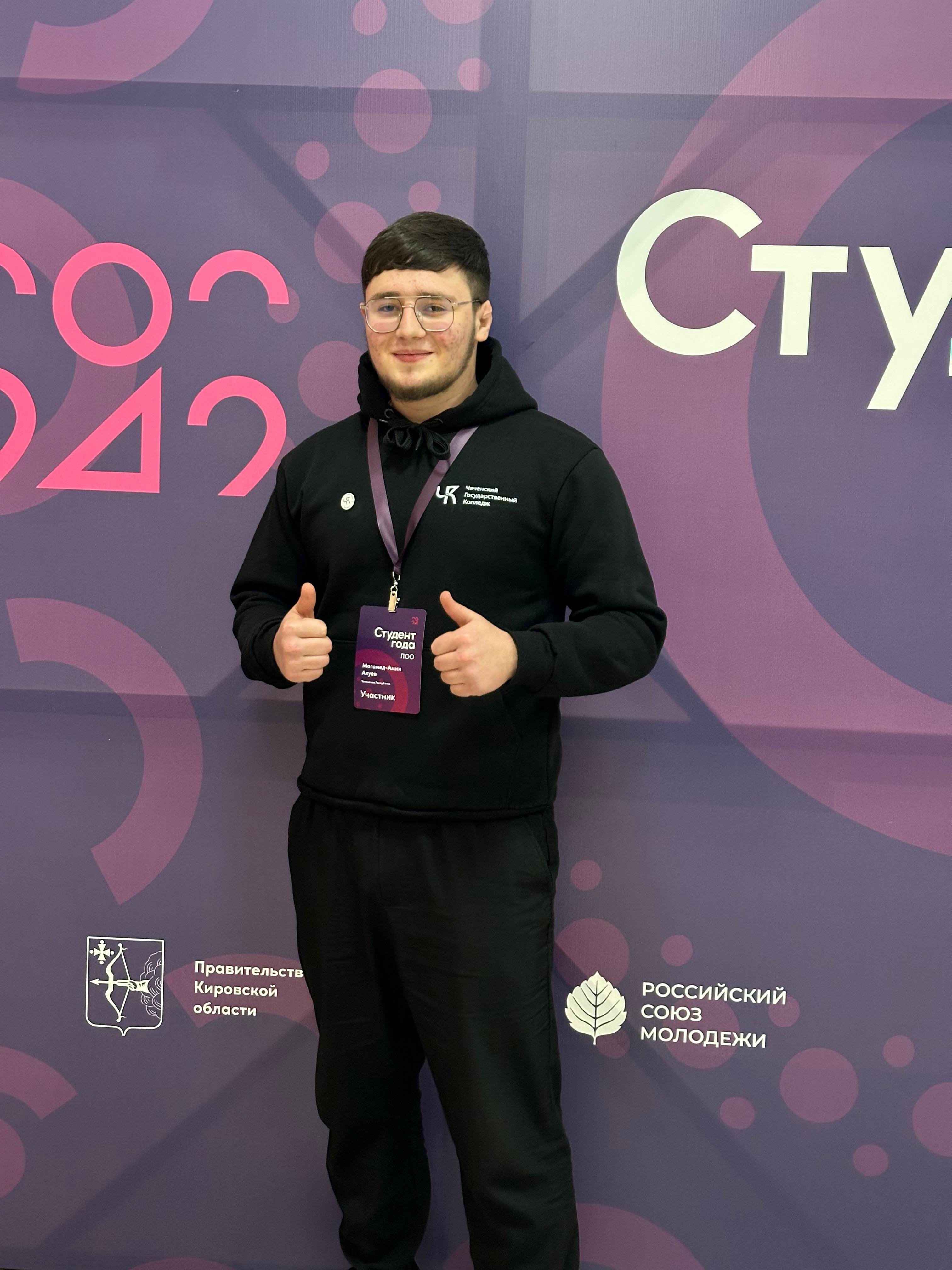 26 ноября 2024 года в Кирове на базе ВятГАТУ состоялась Церемония открытия Национального финала Российской национальной премии «Студент года» профессиональных образовательных организаций, в котором принимает участие победитель Регионального этапа в номинации «Профессионал года», студент Чеченского государственного колледжа Акуев Магомед-Амин.