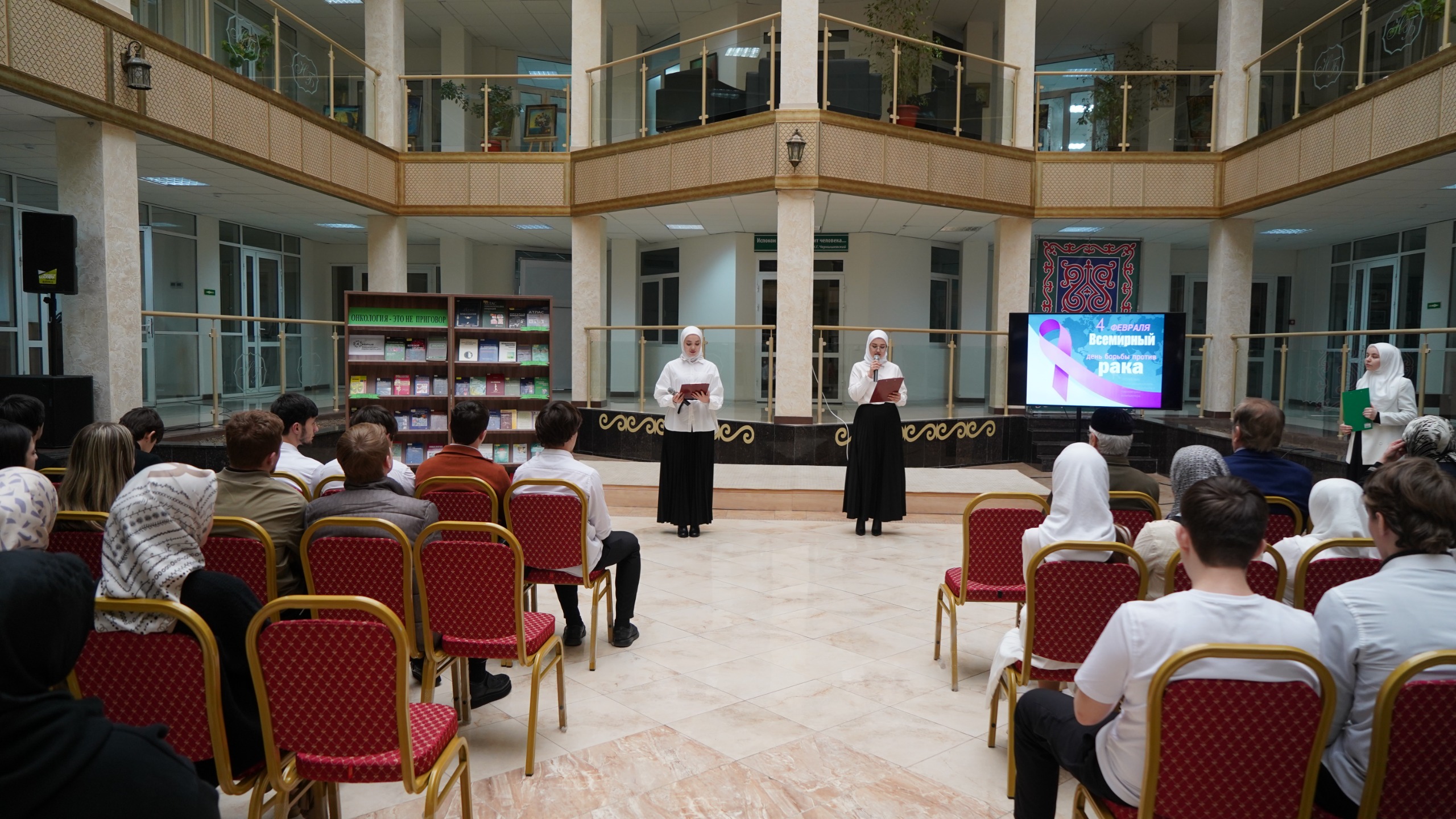 4 февраля студенты ЧГК приняли участие в профилактическом мероприятии «Как жить без страха», приуроченном ко Всемирному дню борьбы с раковыми заболеваниями, которое прошло в Зимнем саду Национальной библиотеки ЧР.