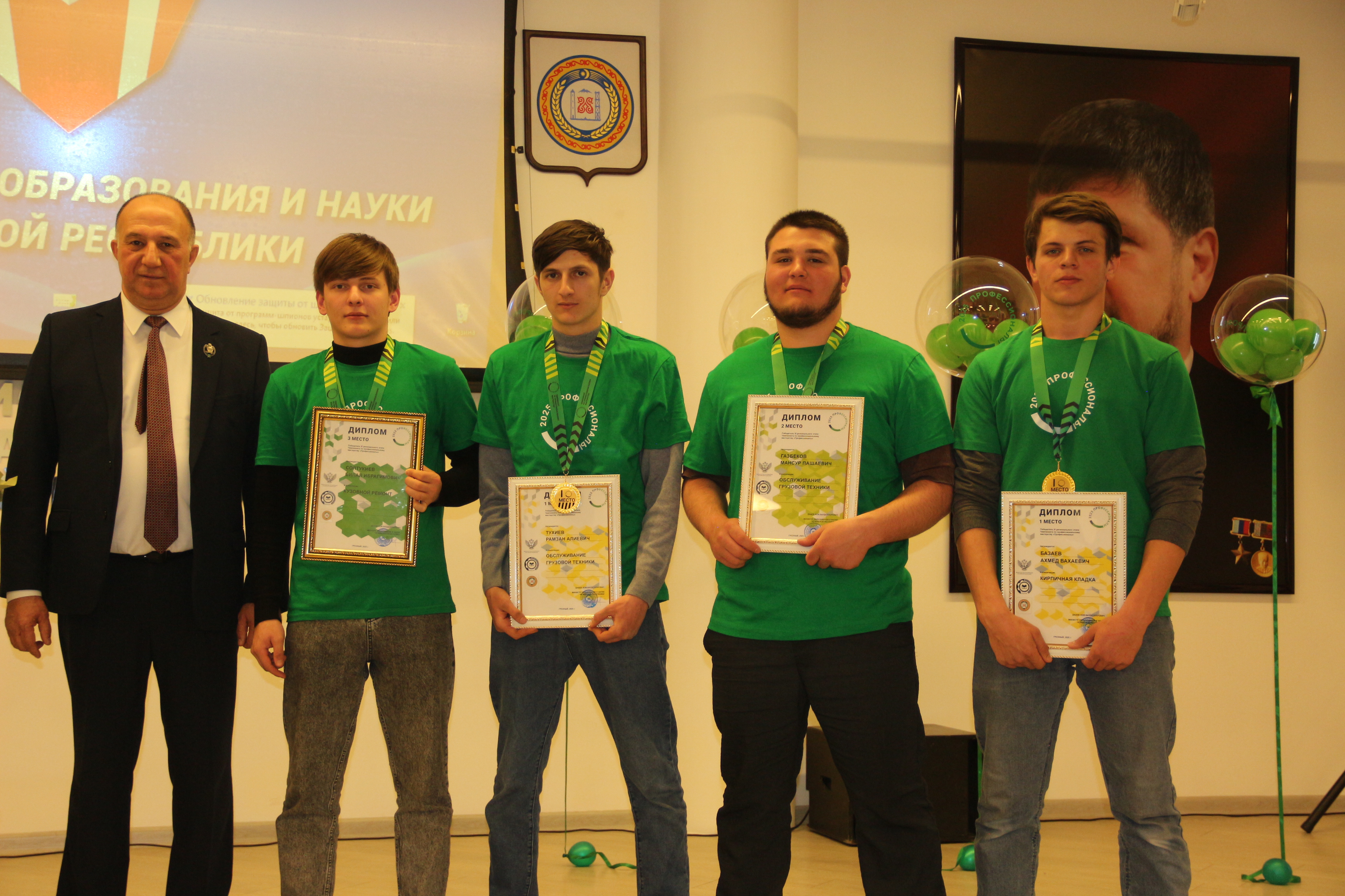 Так, первое место заняли: Базаев Ахмед Вахаевич (Кирпичная кладка), Бабушев Асхаб Умарович (Электромонтаж), Автаев Мансур Алиевич (Ремонт и обслуживание легковых автомобилей); Абдрахманова Марха Романовна (Документационное обеспечение управления и архивоведения); Тухиев Рамзан Алиевич (Обслуживание грузовой техники).