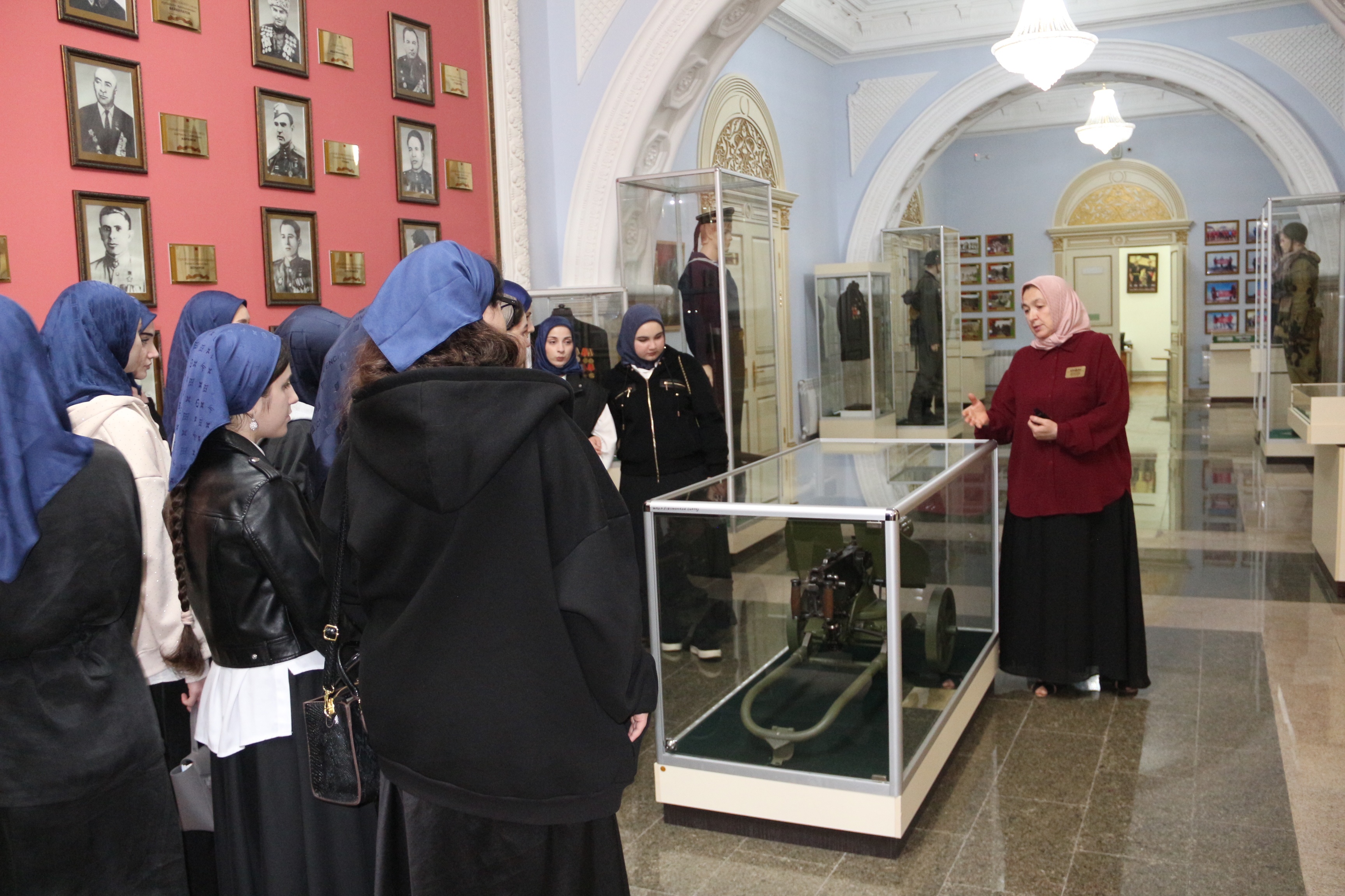 Основной интерес студентов привлекла тема Великой Отечественной войны. Под руководством сотрудницы музея, студенты рассмотрели барельефы с изображением Героев СССР уроженцев Чечено-Ингушетии, барельефы с изображением эпизодов Великой Отечественной войны, Памятник Маташу Мазаеву и танкистам Великой Отечественной войны и другие экспонаты.