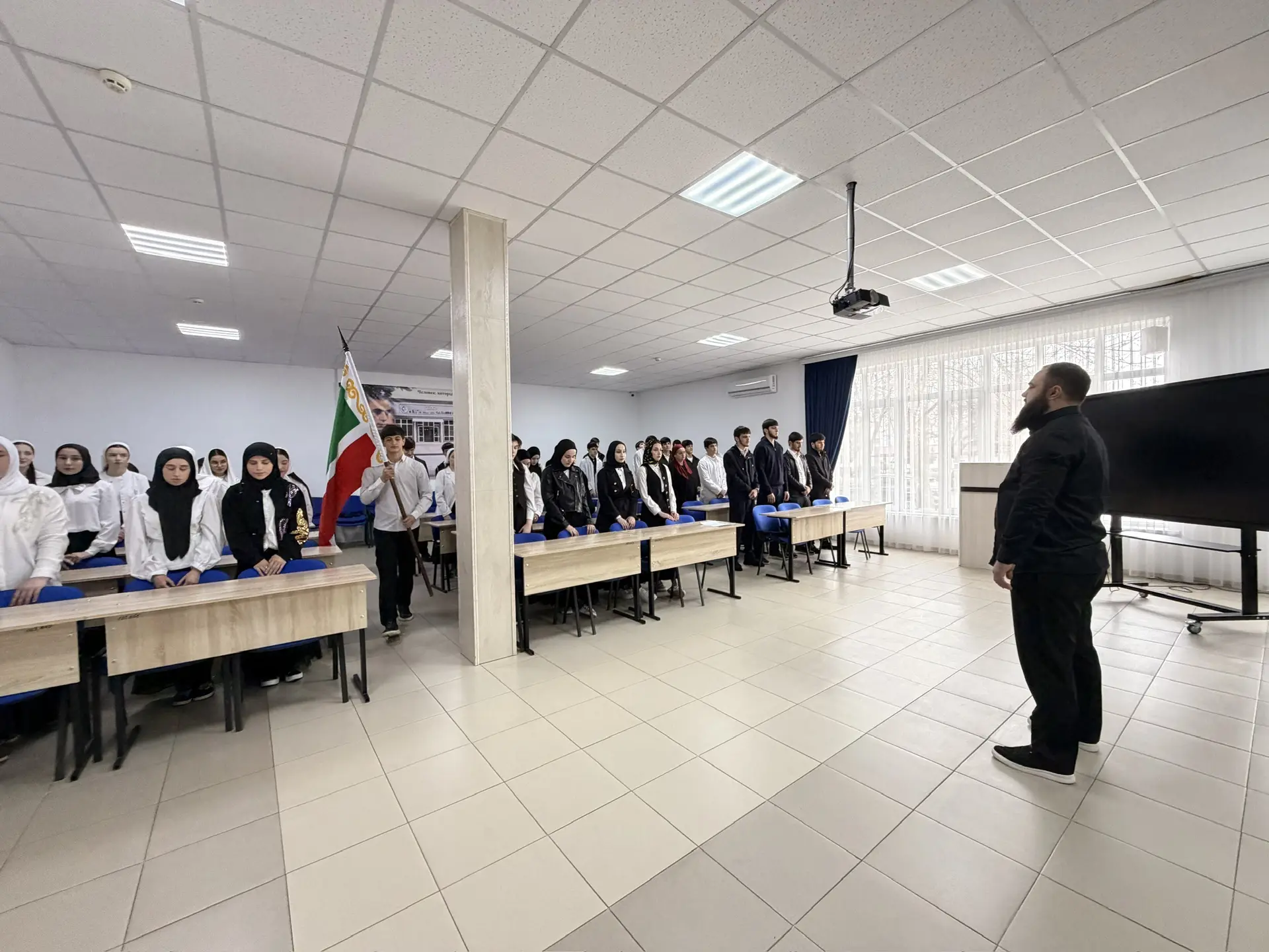 30.03.202630 марта в ГБПОУ «КГК им. Ш. Калиева» состоялась еженедельная патриотическая акция церемониального выноса флагов РФ и ЧР и исполнения гимна РФ и ЧР.На церемонии присутствовали студенты, преподаватели и сотрудники колледжа.Особая честь выноса и установления флагов выпала студентам: Хусиханову Халиду и Бициеву Абдул-Малику.После церемонии студенты отправились на внеурочное занятие "Разговоры о важном". Его темой стал важный для всех возрастов вопрос «Как справляться с волнением?».